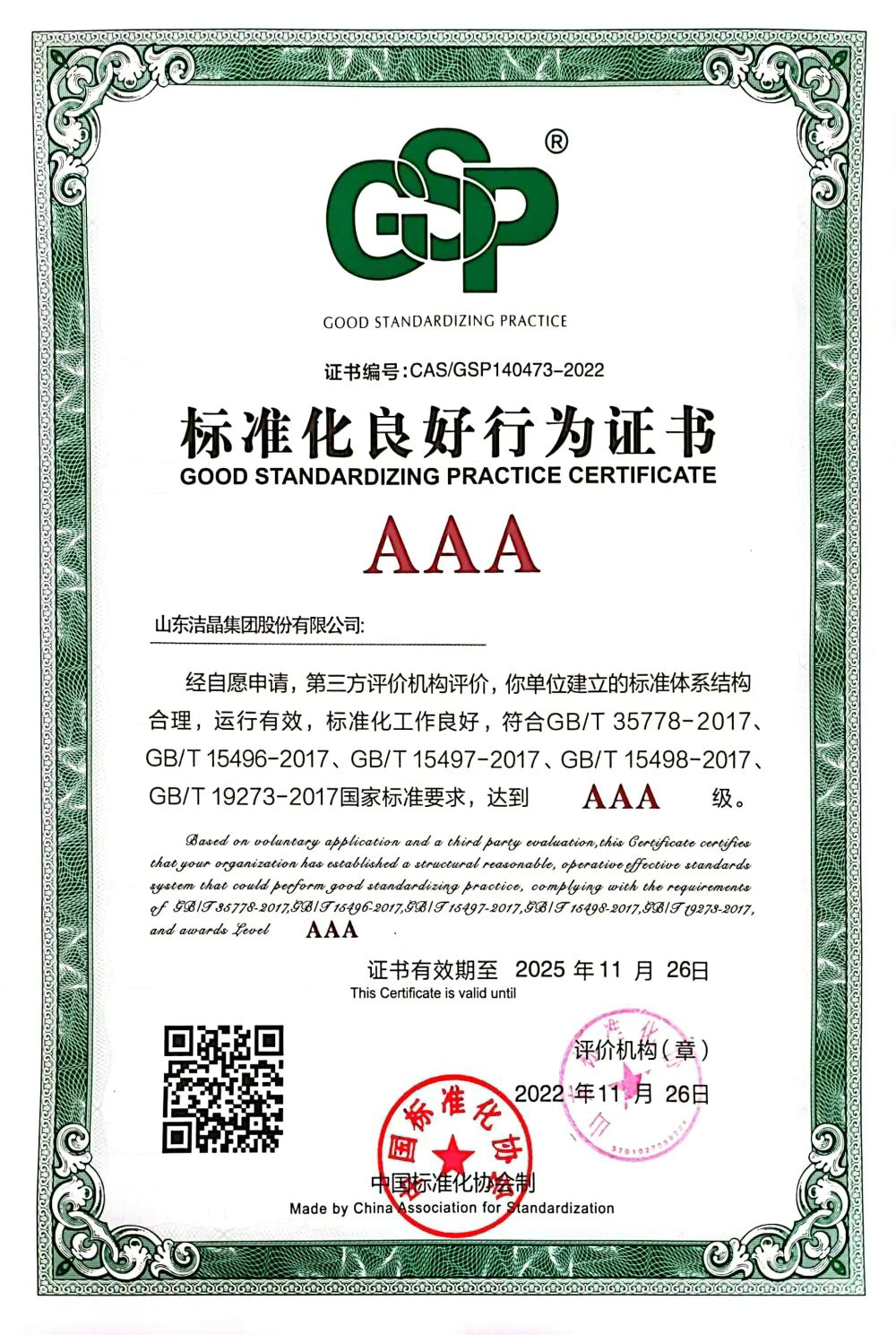 2022年11月26日,經(jīng)前期申報及第三方評價機構(gòu)評價審核,潔晶集團(tuán)獲得AAA級標(biāo)準(zhǔn)化良好行為證書。